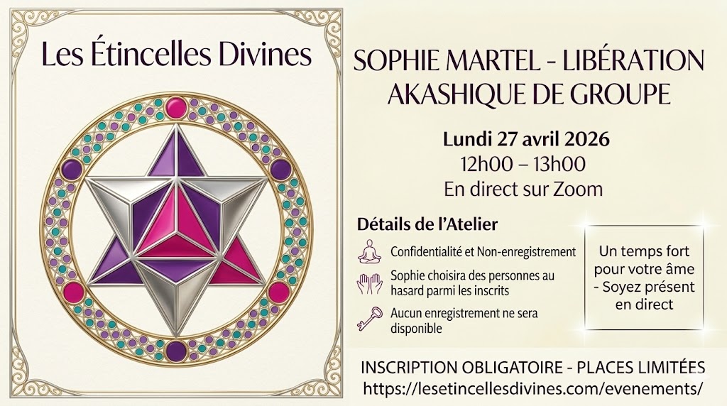 â ïžÂ ĂVĂNEMENT EN DIRECT UNIQUEMENT : Par respect pour la confidentialitĂ© et l'Ă©nergie de l'espace akashique, cet atelier ne sera pas enregistrĂ©. Aucune rediffusion ne sera disponible.